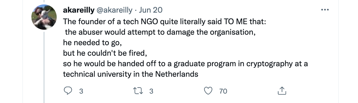 In his rebuttal, D.J.B. discloses that Jacob was staying at his and Tanja's house with Roger Dingledine, the co-founder of Tor, when Tor was negotiating Jacob's resignation. Dingledine has not made a public statement about Appelbaum, and is most likely the "founder of a tech NGO" referenced in this thread.