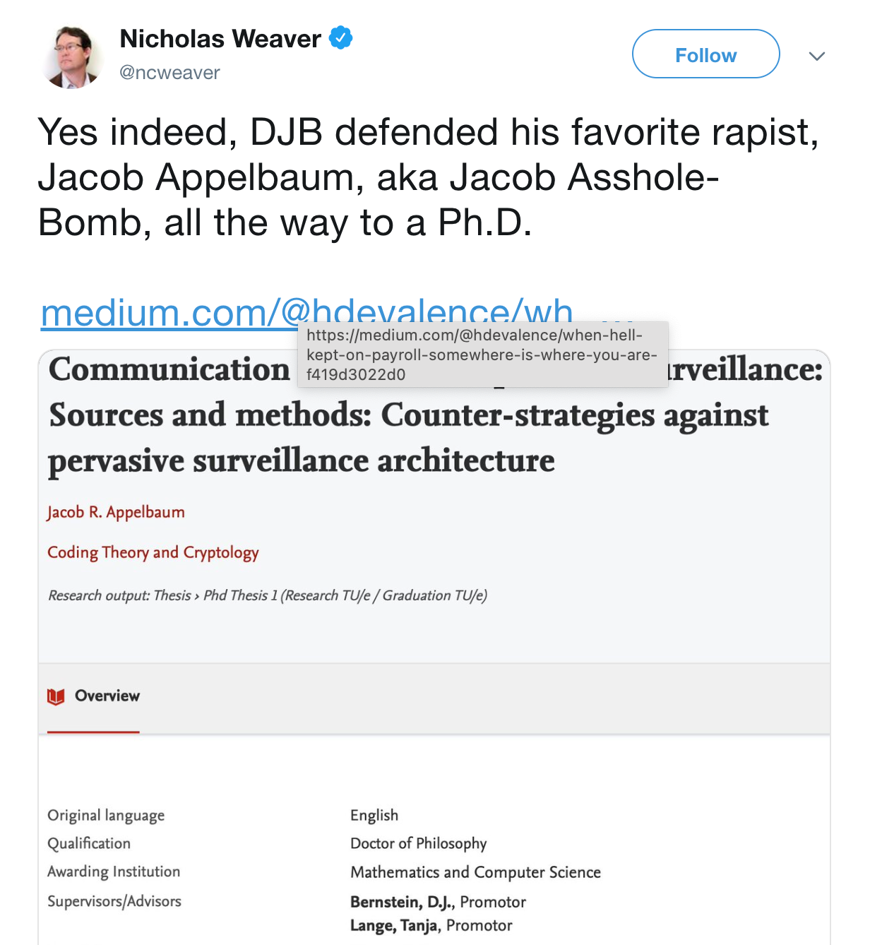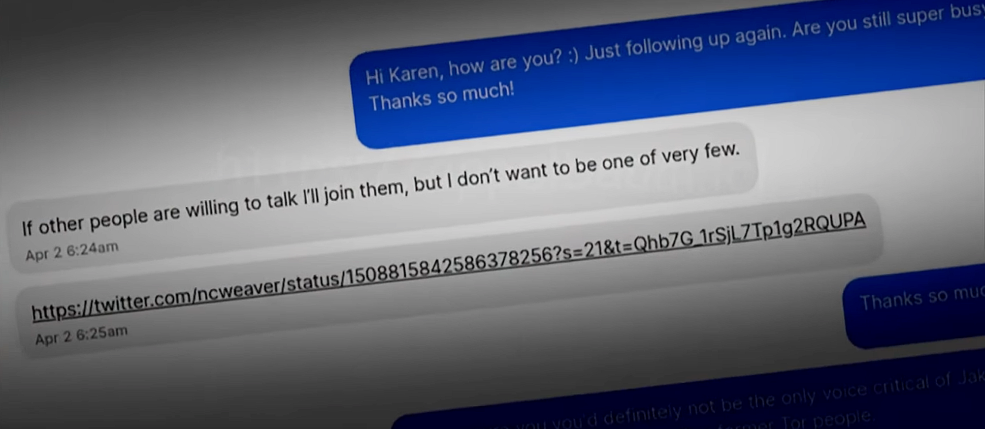 Karen Reilly, a former Tor Project employee, declined to participate in the film as they signed a non-disclosure agreement. The link Reilly is pictured as sending off the record to the filmmakers was to the following (now locked) tweet, and refers to DJB, Appelbaum's academic advisor: